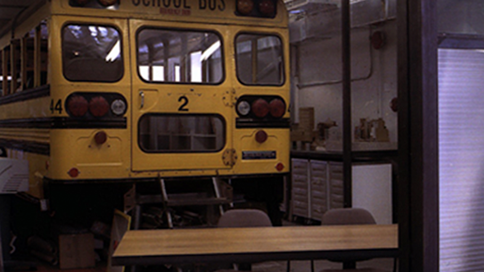 Progressive interior gut renovation (Architect's office). The renovated office includes a conference area, work stations, tenant rental spaces, bathroom, workshop, model shop, principal's office, and back office. The main element in this architectural office was a full-sized school bus. The working metaphor established the principal as the bus driver taking the office forward. The school served as a bridge between the principal's involvement with academia and immersion in the pragmatics of the current architectural profession. The office was quite an efficient vehicle for working and allowed for the division of the space effectively into service and served areas.